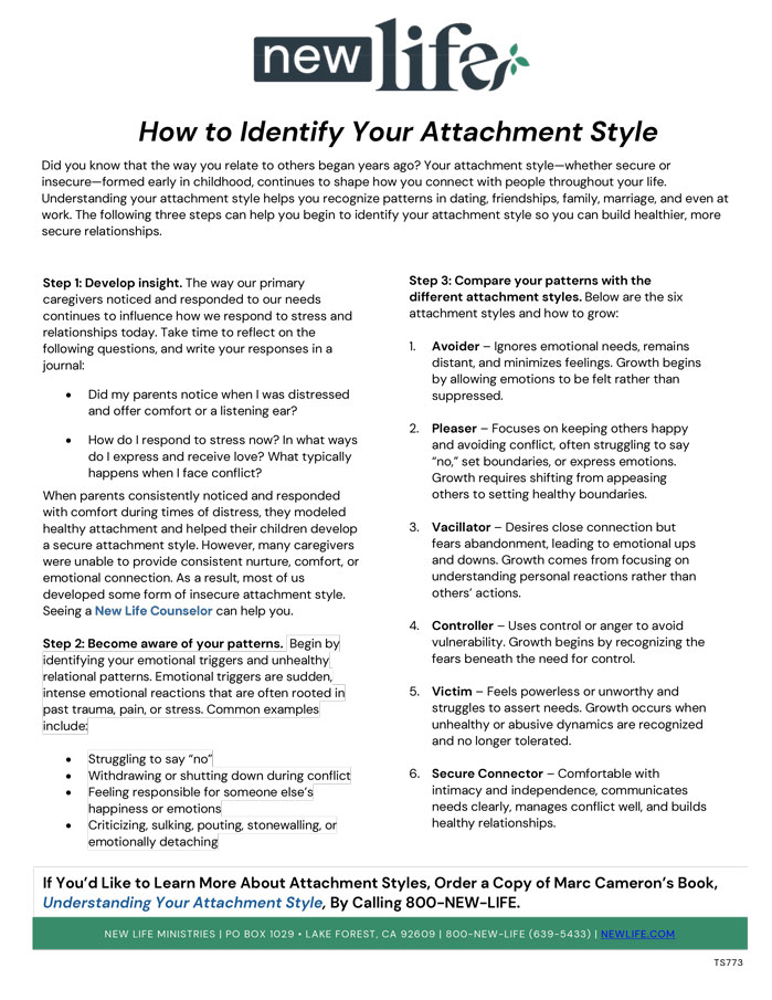 Join Becky Brown, President of New Life, and New Life LIVE cohost & author Marc Cameron, for this faith-based Zoom webinar on March 19. Together, they will guide you toward greater understanding of your attachment style and how it impacts your relationships today. More importantly, you’ll discover how God invites us toward healthier, more secure connection—no matter your past.